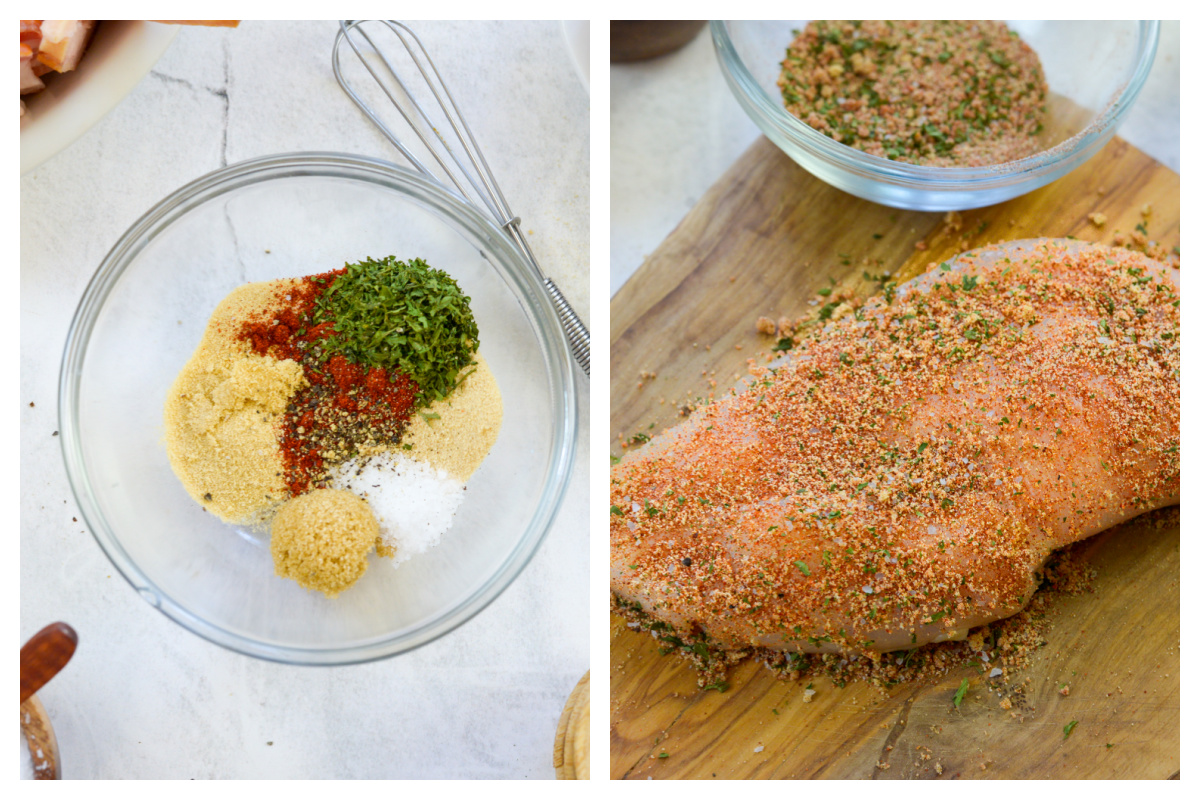 Start by pounding the chicken breasts to ensure even cooking. In a small bowl, combine the garlic powder, onion powder, smoked paprika, brown sugar, salt, and pepper. Rub the seasoning evenly over both sides of the chicken breasts.