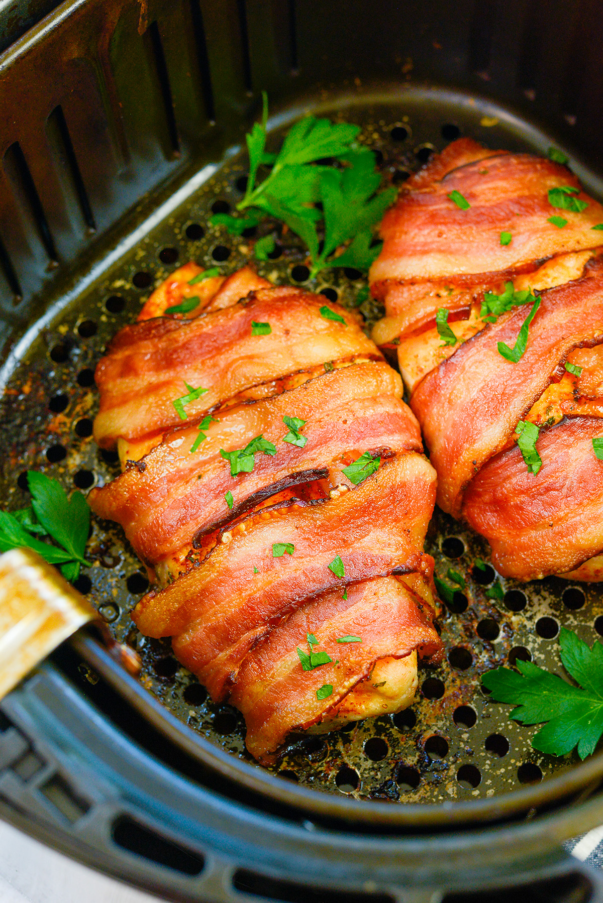 Preheat your air fryer to 380°F. Place the bacon-wrapped chicken in the air fryer basket, ensuring there’s space between each breast for proper airflow. Air fry for 12 minutes, then increase the temperature to 400°F and cook for another 2 minutes to achieve crispy bacon perfection.
