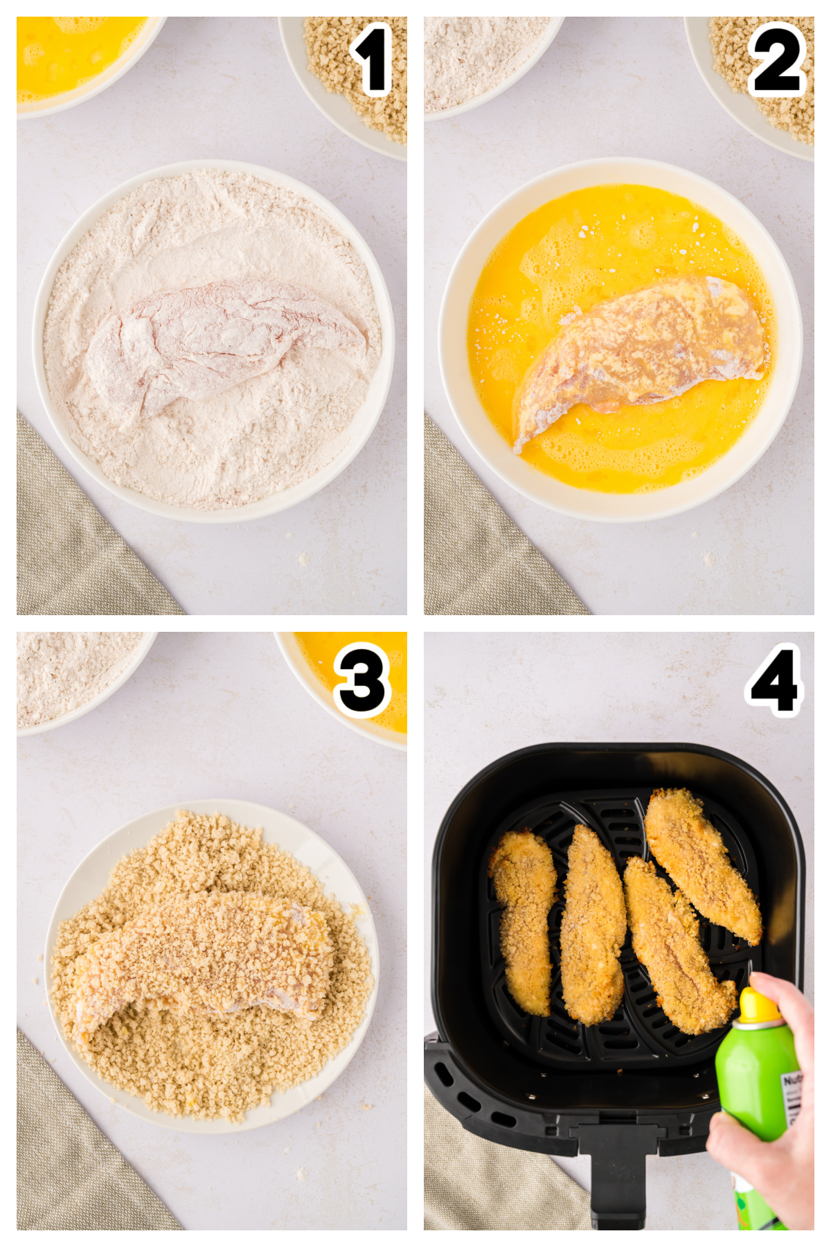 - Spritz the tops of the chicken tenders with cooking spray (this helps them crisp up).
