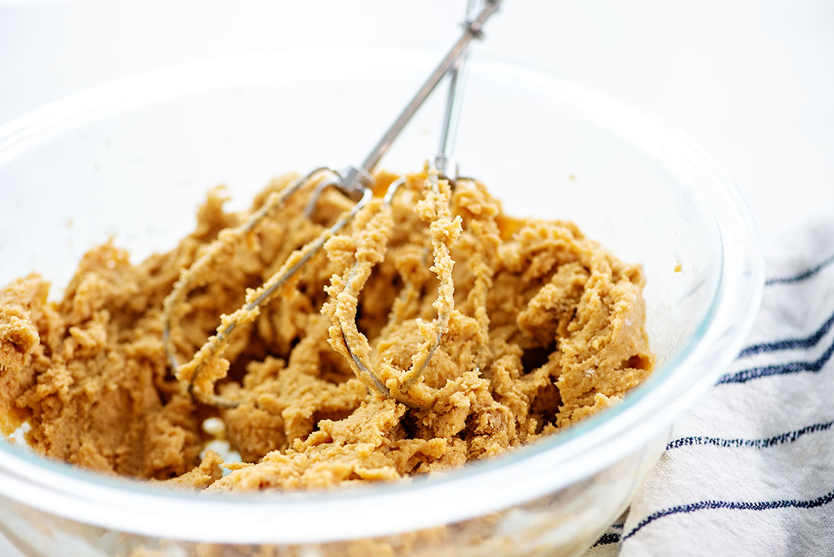 Start by creaming together the butter and sugars. Then, beat in the egg, vanilla, and peanut butter until smooth. Once creamy, fold in the dry ingredients.
