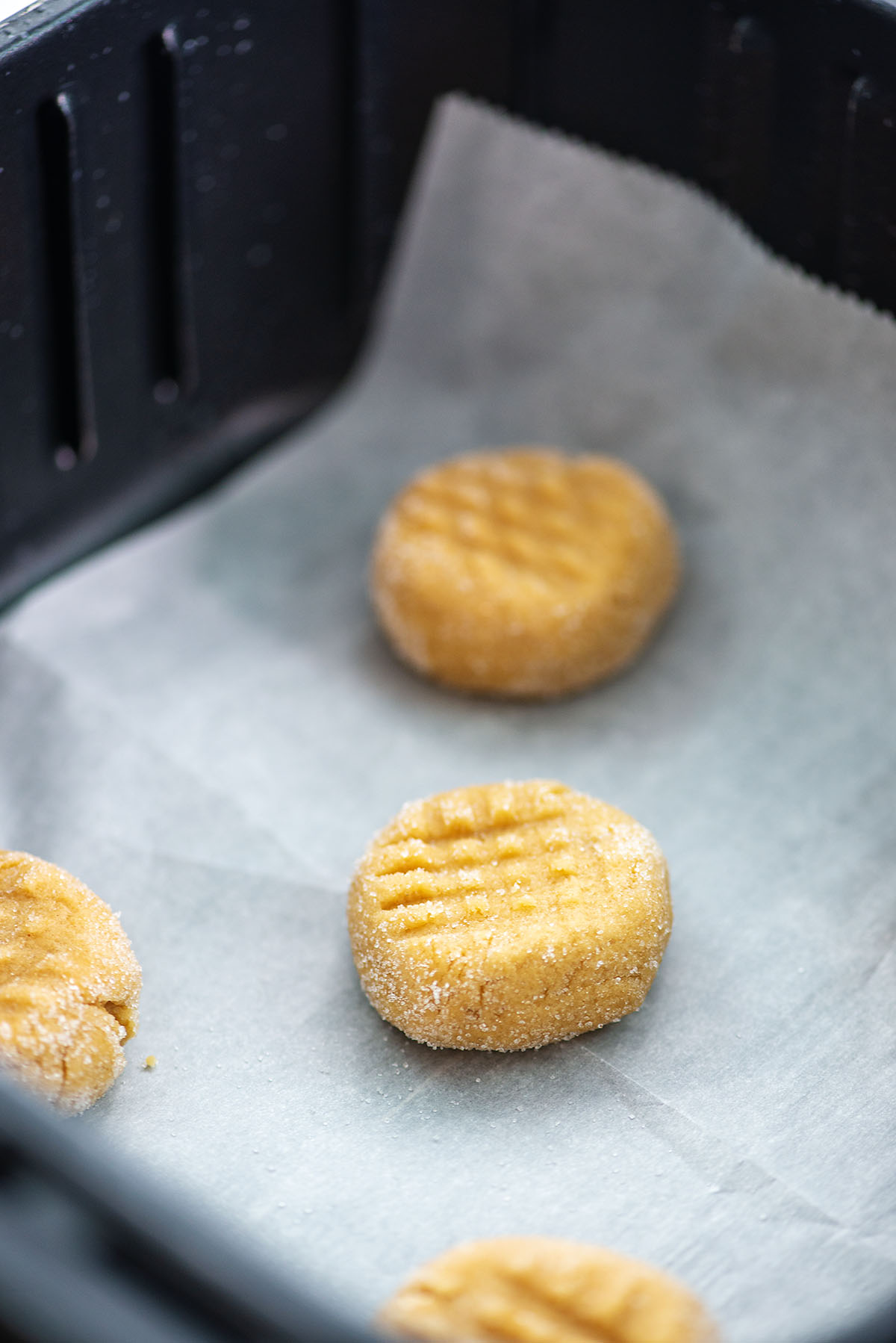 Line your air fryer basket with parchment paper, then space out the dough balls, giving them room to spread. We fit about five cookies per batch. Use a fork to create a criss-cross pattern on each one, then air fry at 350°F for 5 minutes.