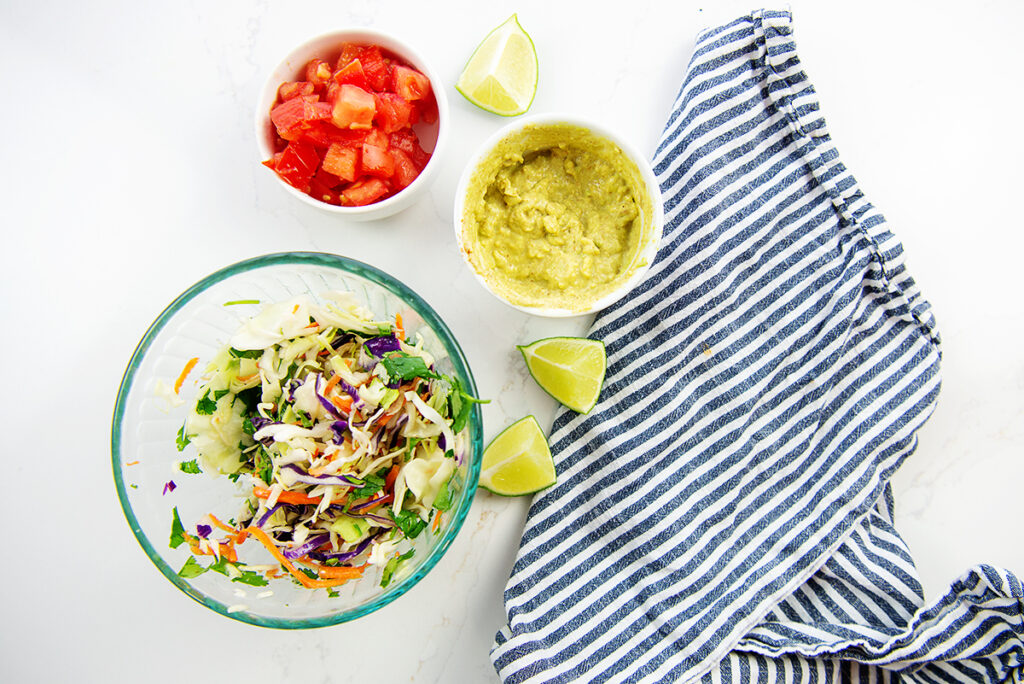 - Make the cilantro lime slaw: In a medium mixing bowl, combine the coleslaw mix, chopped cilantro, lime juice, olive oil, and a little salt. Toss until everything is evenly coated.